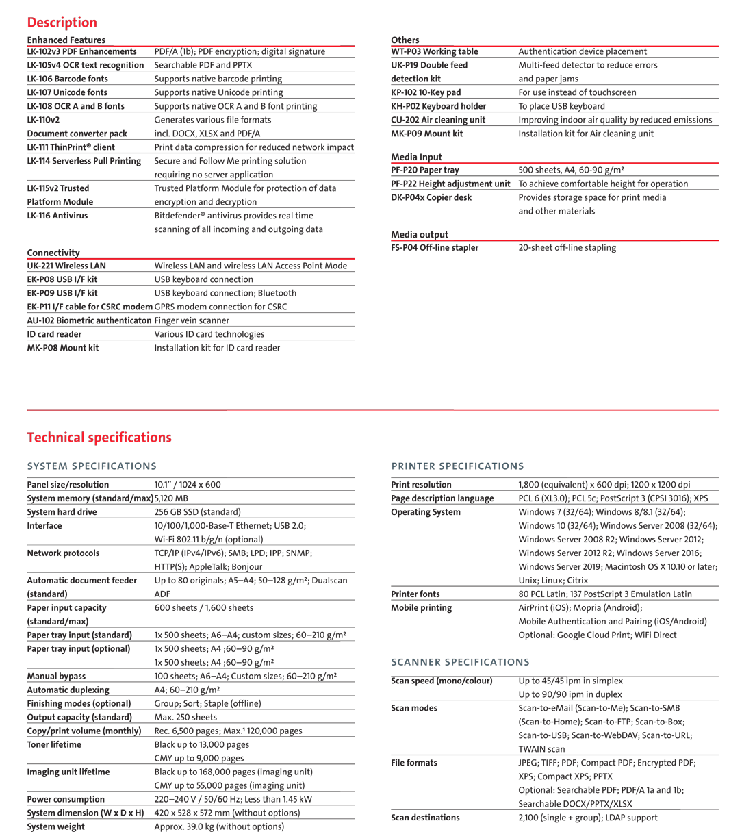 Fax with Super G3 fax option for fast transmission and digital reception, polling, time shift, PC Fax, receipt to confidential box, receipt to e-mail, FTP, SMB